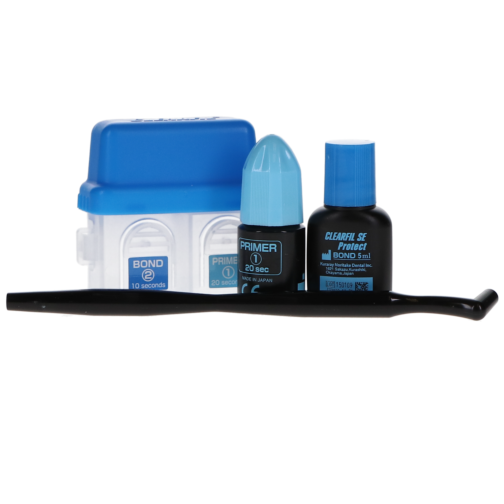 Each Protect Bond Kit contains 1 (6 ml) bottle Clearfil SE Protect Primer, 1 (5 ml) bottle Clearfil SE Protect Bond, 2 x brush holders white and black, 1 x mixing dish, 1 x light-blocking plate, 1 x outer case, and 100 disposable brush tips.