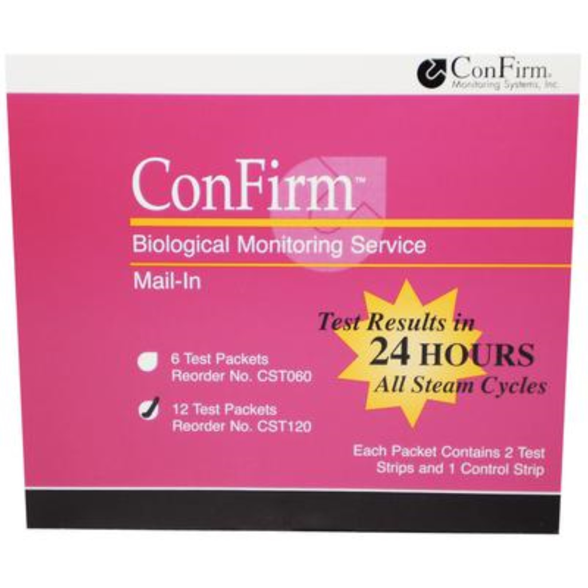 ConFirm? Biological Monitoring Service is the most comprehensive mail-in service in healthcare, with results in just 24 hours! Everything you need to verify sterilizer performance, even to help you stay on your testing schedule. Test results in 24 hours - Steam cycle test results in 24 hours; your choice of immediate test failure notification by telephone, fax or email; complete sterilization test results are faxes or emailed quarterly