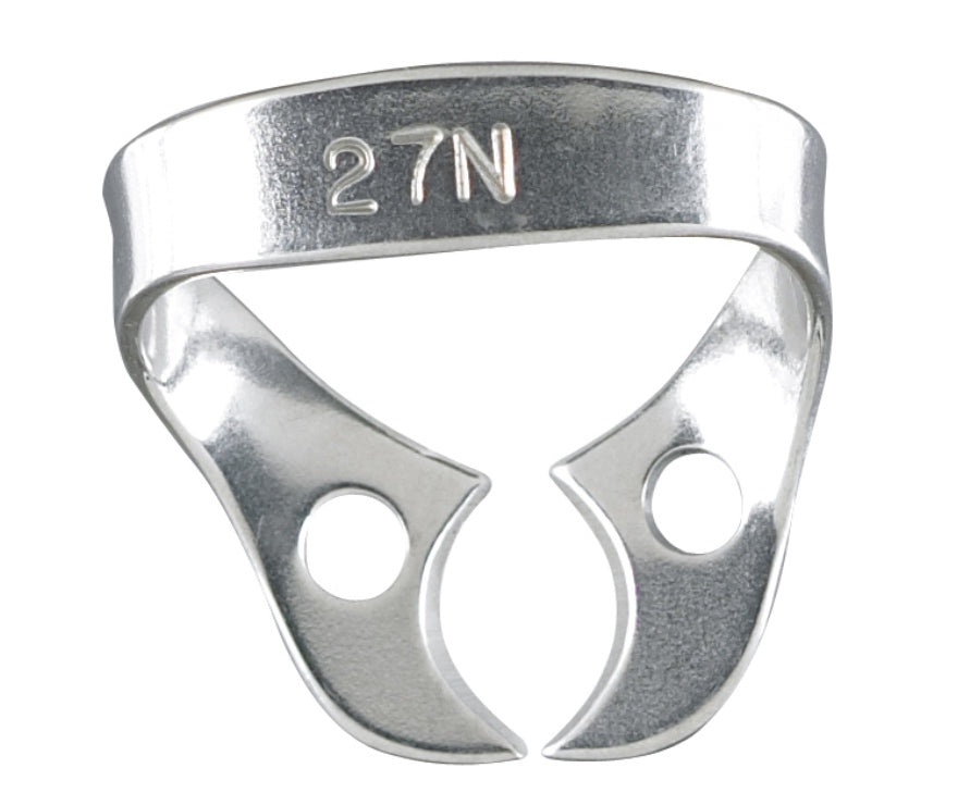 The ready-cut Rubber Dam Clamp # 27N is designed to grip teeth in place during various dental procedures. These wingless clamps are suitable for sterilization in autoclaves and ensure a long service life with their metal make.