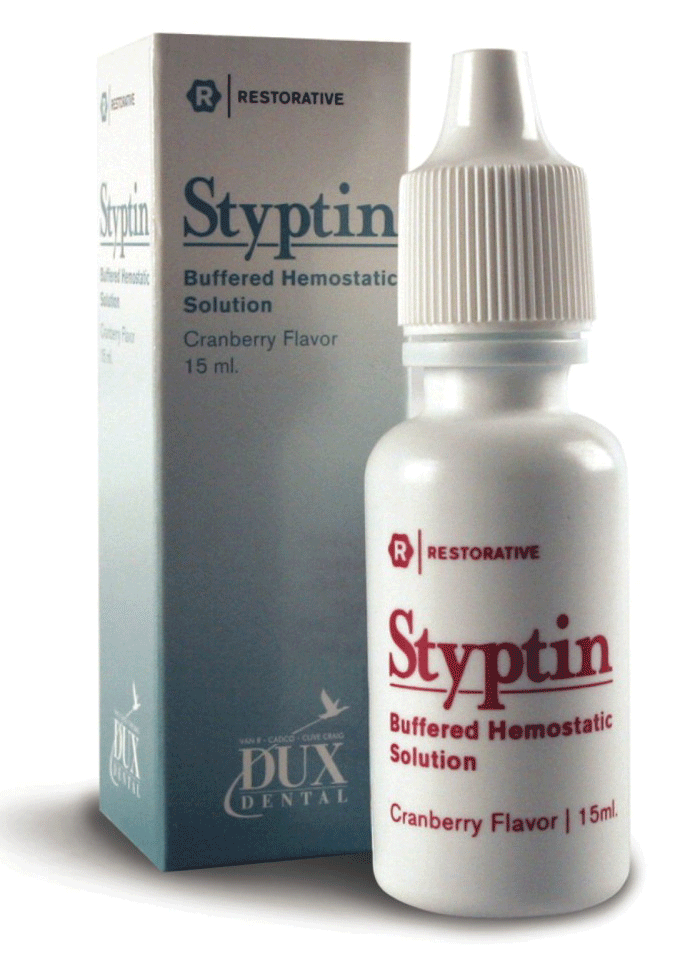 Styptin is a fast-acting hemostatic formulated with 20% buffered aluminum chloride. This solution provides greater visibility for operators with its blue coloring, does not run from the application site due to its high viscosity, and releases a cranberry flavor when applied.